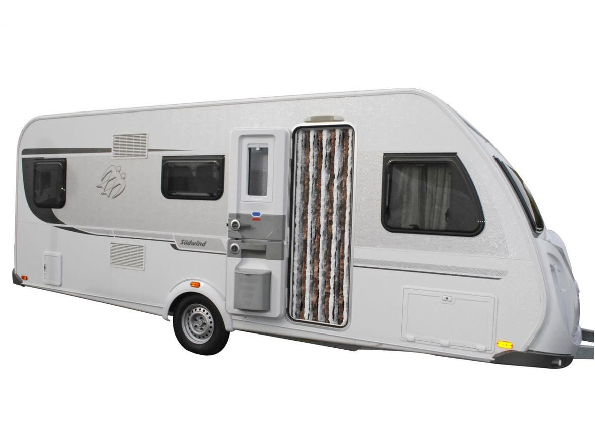 Ein dekorativer Flauschvorhang für Türen eines Campingwagens.