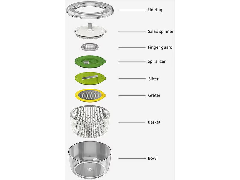 Dieses raffinierte Schüsselset enthält vier austauschbare Scheiben für die Salatzubereitung: 1. Salatschleudern 2. Spiralschneiden 3. Reiben 4. Schneiden.