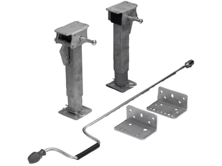 Zwei mitgelieferte Universalbefestigungsadapter werden einfach an geeigneter Stelle am Fahrzeugrahmen befestigt. An diese Adapter wird die Stütze (in zwei Längen lieferbar) angeschraubt. Mit Hilfe eines Stecksystems lassen sich Bodenunebenheiten schnell und effektiv ausgleichen. Die mitgelieferte Kurbel wird auf die Antriebswelle gesteckt und schon lässt sich die Stütze im rechten Winkel nach unten kurbeln.