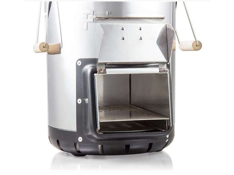 Um den Raketenofen von Petromax zu befeuern, öffnest Du einfach die Klappe der Brennkammer und schiebst das Brennmaterial in die Öffnung. Du legst nach Bedarf nach und regulierst so die Hitze im Ofen.
